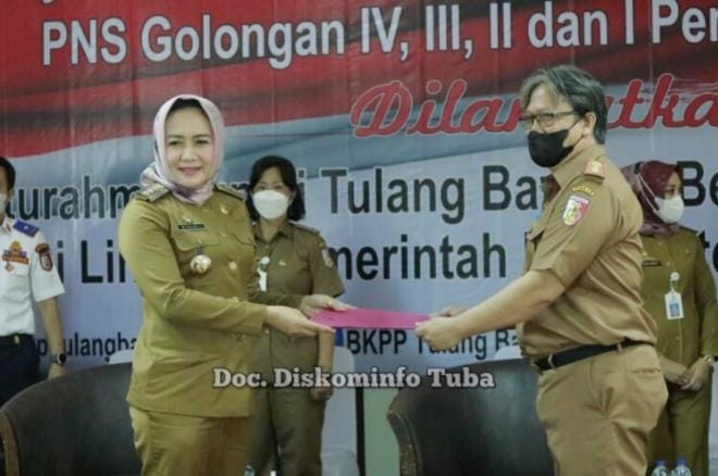 Bupati Tulangbawang Dr.Hj Winarti S.E.,M.H menyerahkan 268 SK kenaikan pangkat kepada Pegawai Negeri Sipil (PNS) periode April 2022 di Islamic center Menggala (23/5/2022).