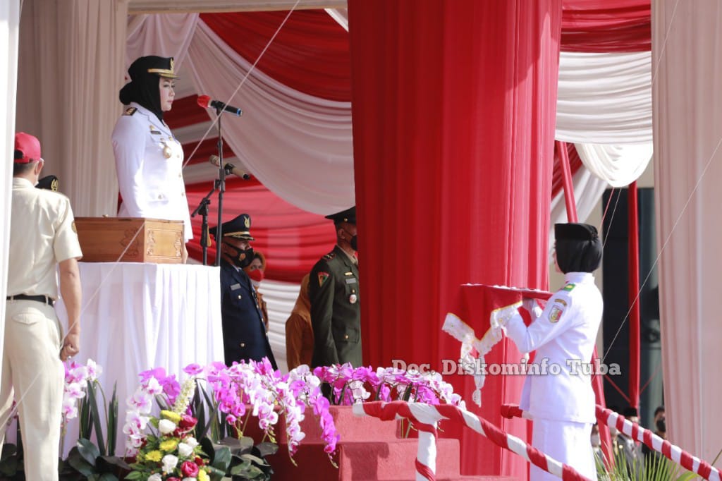 Bertindak sebagai inspektur upacara, Bupati Tulangbawang, Dr. Hj. Winarti S.E.,M.H dan petugas upacara dari jajaran Polres Tulang Bawang