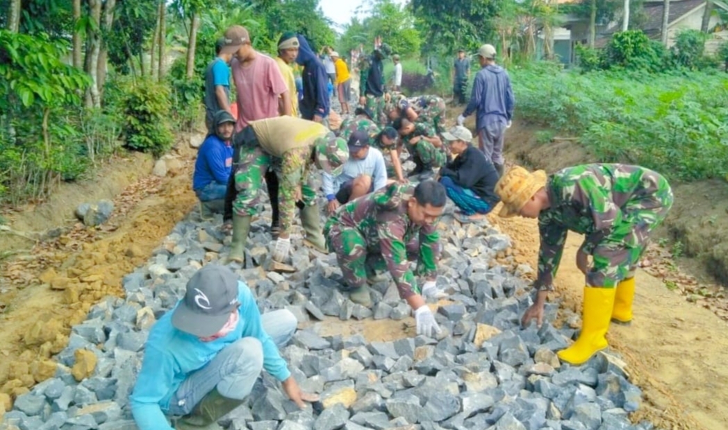 Puluhan personel satuan petugas (Satgas) TNI Manunggal Membangun Desa (TMMD) ke-113 Kodim 0411/KM bersama masyarakat gotongroyong membangun jalan guna percepatan target sasaran (15/05/2022).